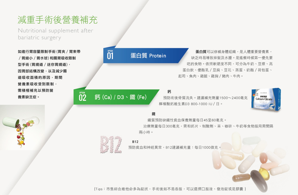 鈣(calcium) Vitamin D | 鈣: (一)BPD/DS:1800-2400mg/d (二)LAGB,SG,RYGB:1200-1500mg/d Vitamin D3: 800-1000IU/d | 鈣: (一)BPD/DS: 1800-2400mg/d (二)LAGB,SG,RYGB: 1200-1500mg/d Vitamin D: 3000-6000IU/d |